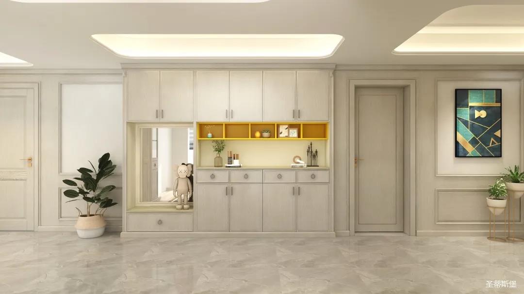▲业主喜欢低调轻奢的空间格调,设计师从功能出发,赋予空间舒适的感受,打造专属的衣帽间,满足业主日常买买买的储物喜好。同时也将艺术元素融入美式现代风格,利用空间的色彩、纹理、家具、配饰、光线等表达空间情绪,再以黄铜金属加持,营造温馨惬意的家居睡眠氛围。